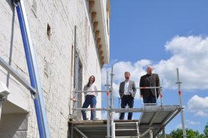 Drei Menschen stehen auf einem Gerüst neben einem massiven Gebäude